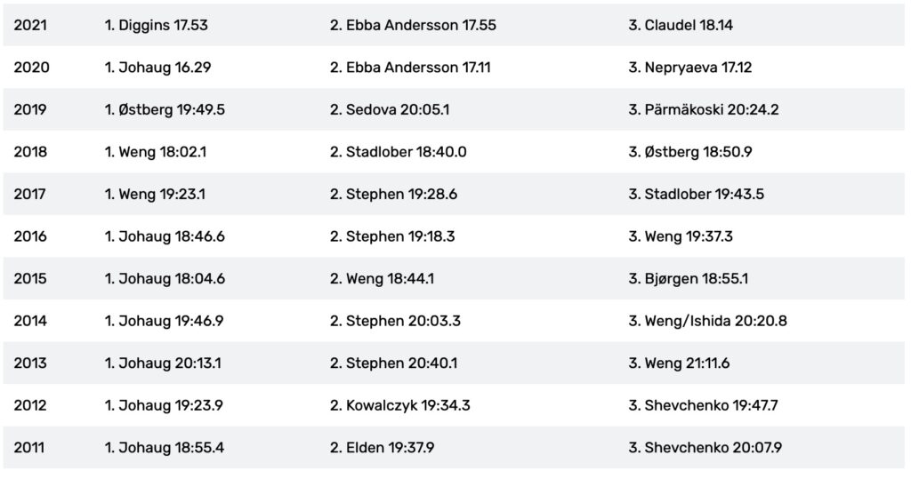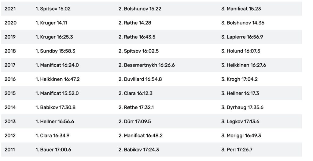 These are the winners from the previous 15 Tour de Ski events.