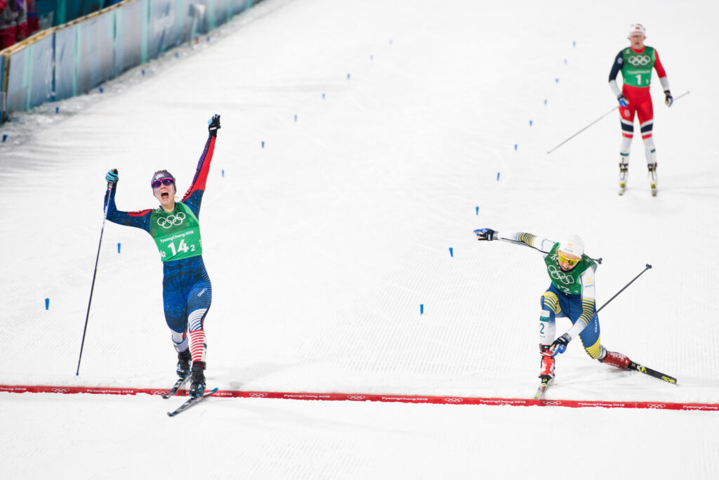 At the 2018 Olympic Winter Games in PyeongChang, Diggins delivered one of the most iconic moments in American skiing history. In a dramatic final sprint, she overtook Stina Nilsson of Sweden to win Olympic gold in the team sprint with Kikkan Randall, claiming the first Olympic cross-country skiing gold medal ever won by the United States. The image of Diggins lunging across the line became an instant classic.