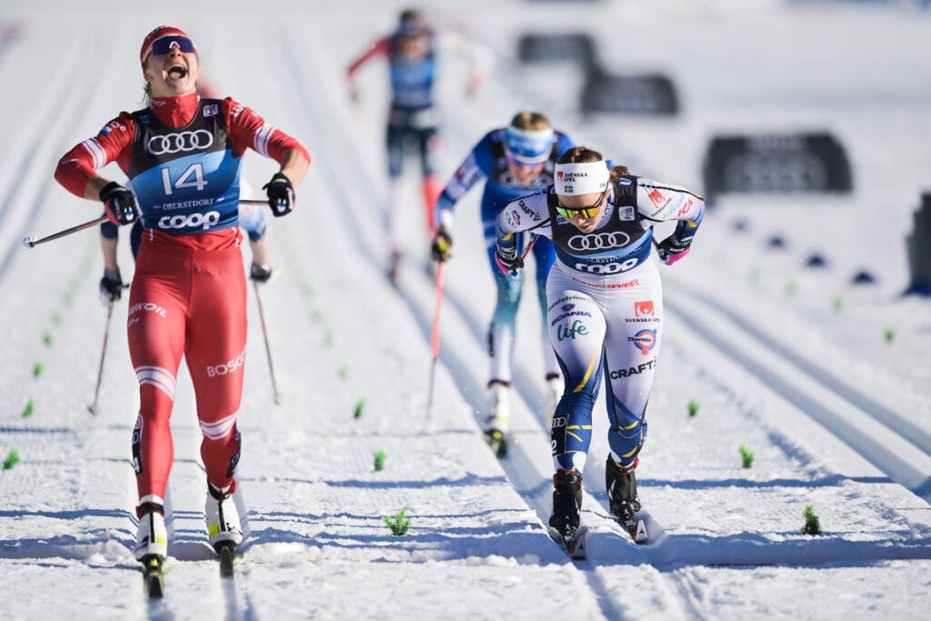 Natalia Nepryaeva of Russia beats Sweden’s Johanna Hägström for the victory in the classic sprint final in Oberstdorf, Germany.